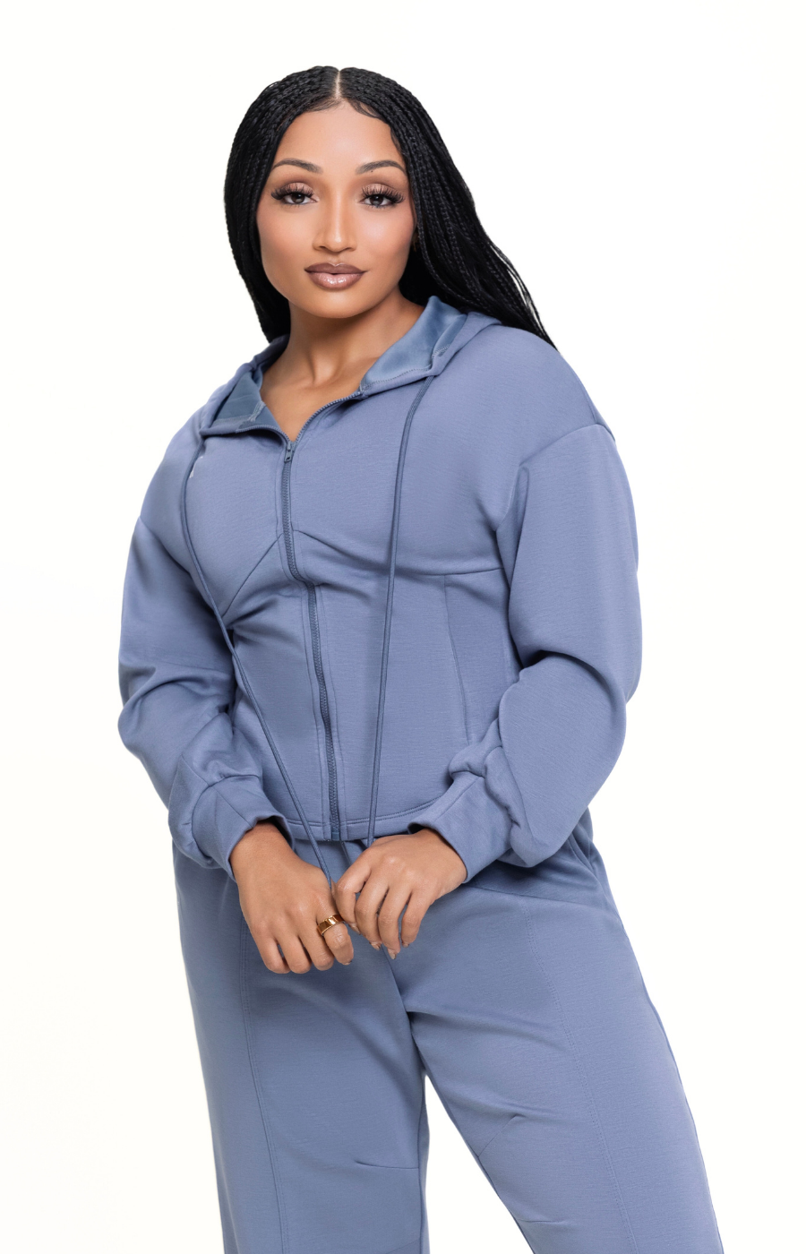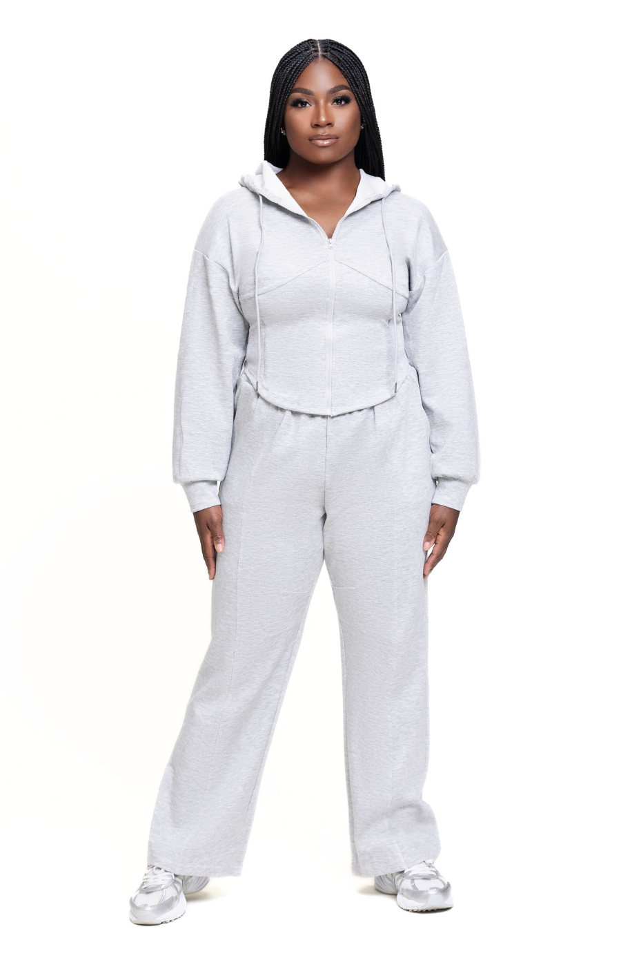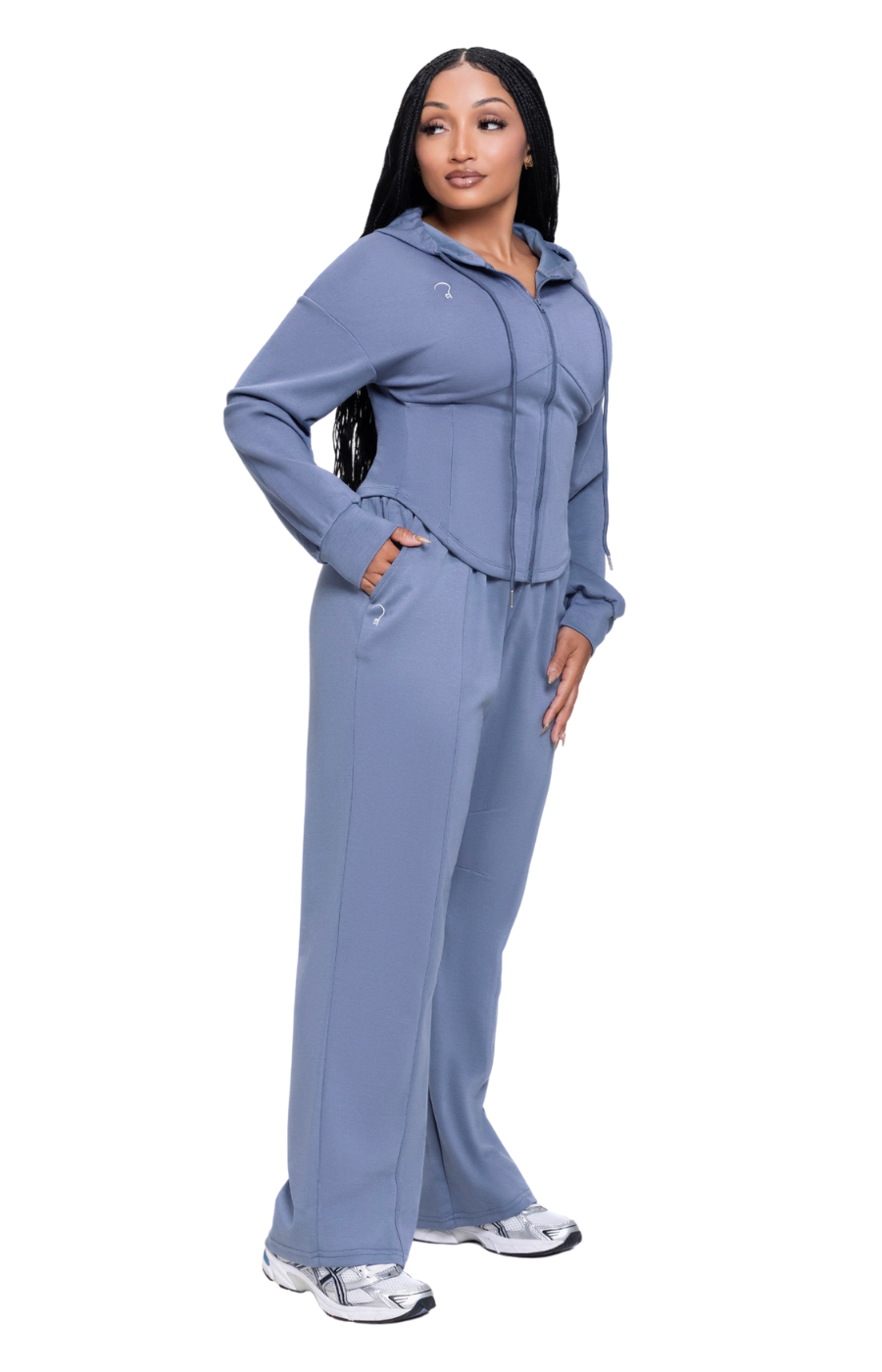 This elevated lounge set features a sculpted zip-up hoodie and wide-leg track pant, crafted from a buttery-soft stretch fabric that flatters your shape while keeping you effortlessly comfortable all day long.