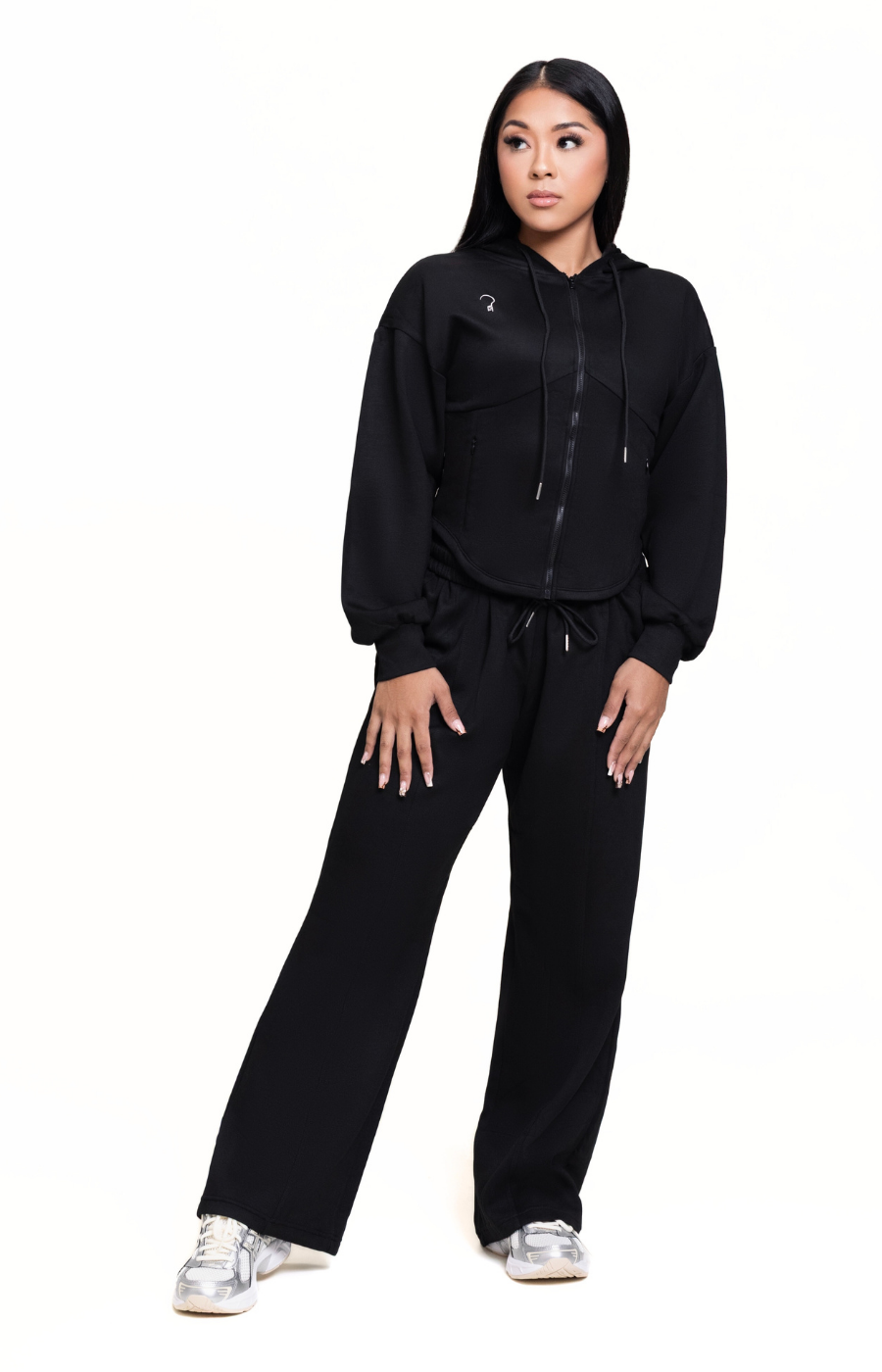 Details: Body-hugging stretch fabric, Lightweight, breathable, and ultra-soft, Sculpted seams for a feminine silhouette, Zip-front hoodie with adjustable comfort, Wide-leg pants with an elastic waistband, Deep side pockets for essentials
